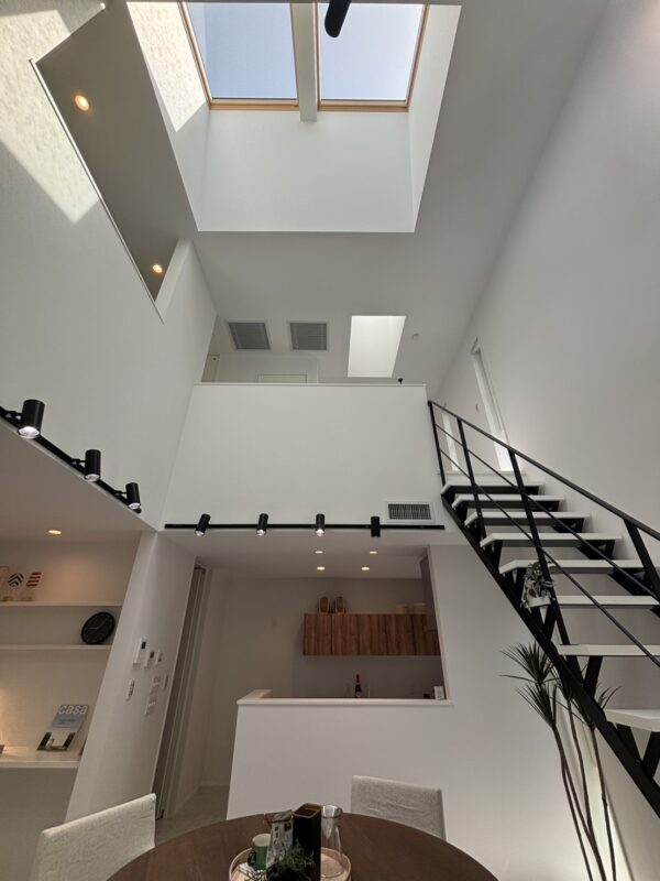 吹抜の天窓から自然の光が降り注いで、晴れの日には電気をつけなくても十分明るいほどです。