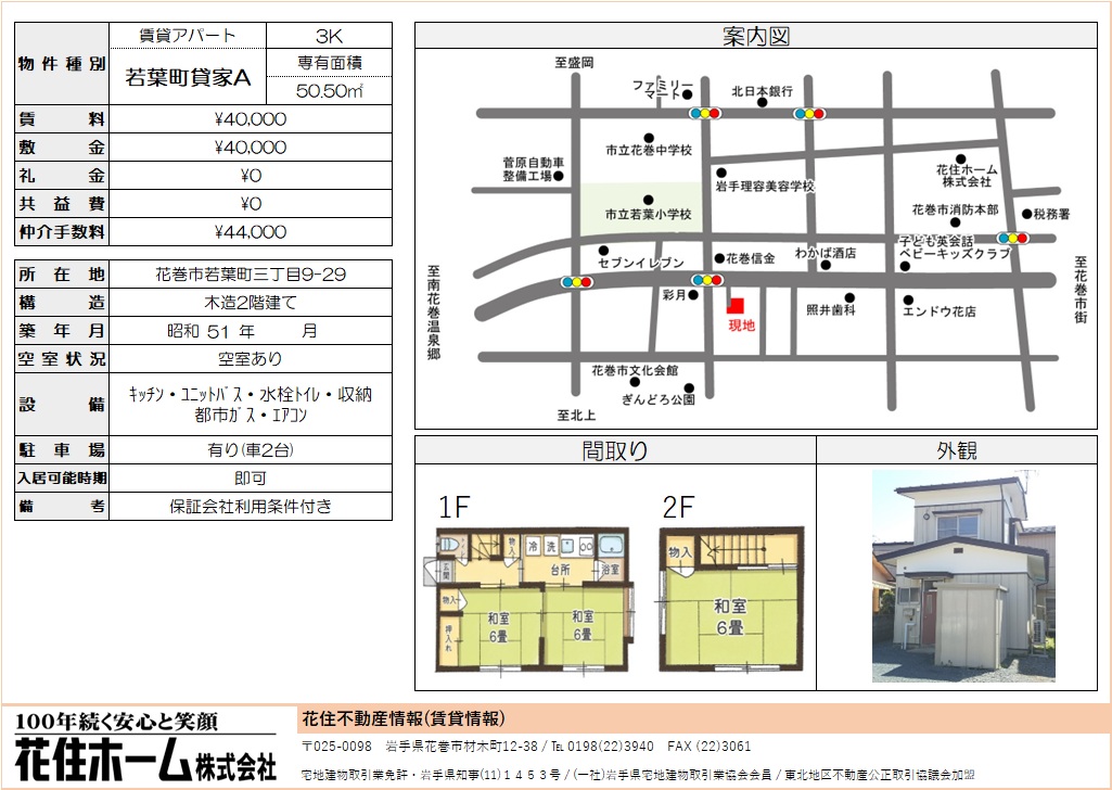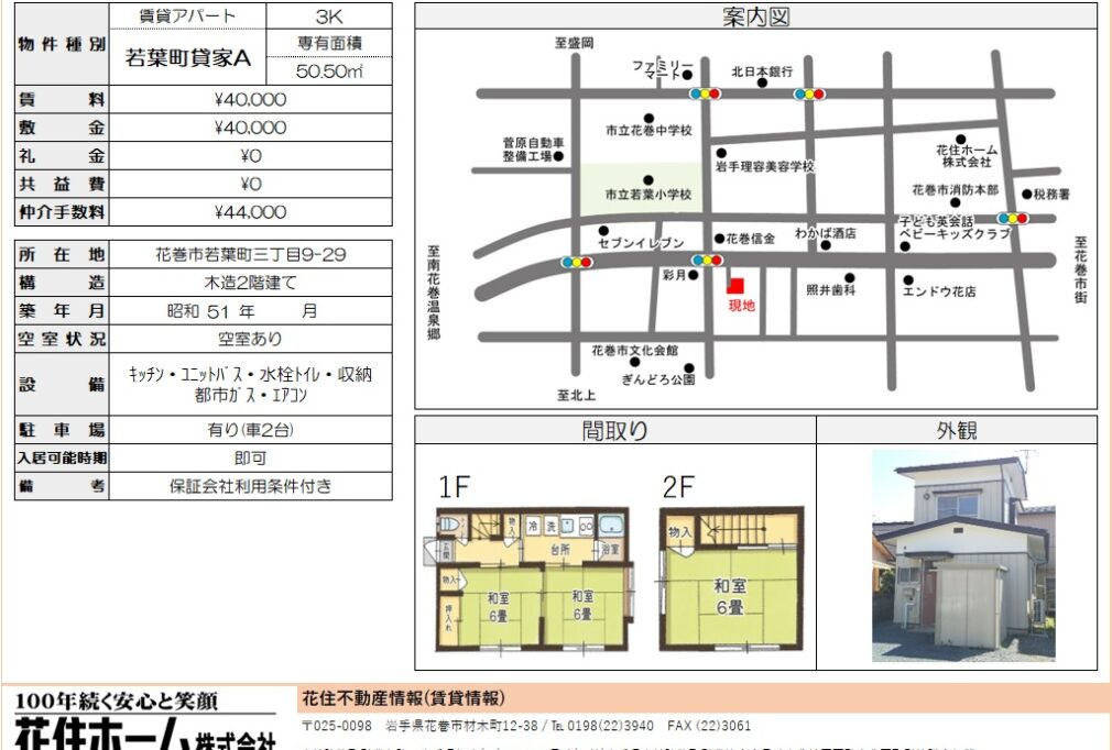 | 所在地 | 花巻市若葉町三丁目9-29 | 家賃・管理費等 | 4万円/管理費等 0円・仲介手数料 44,000円 |