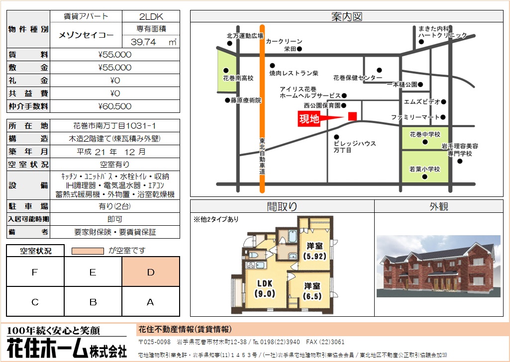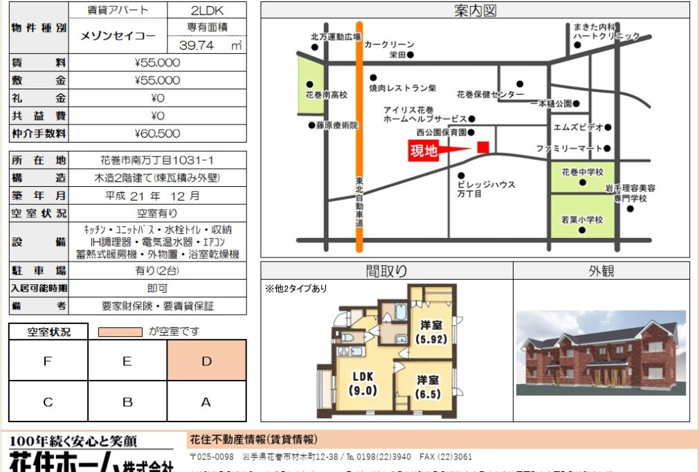| 所在地 | 花巻市南万丁目1031-1 | 家賃・管理費等 | 5.5万円/家賃55,000円、管理費等 0円 |