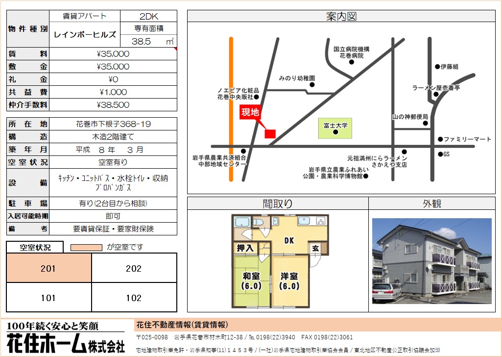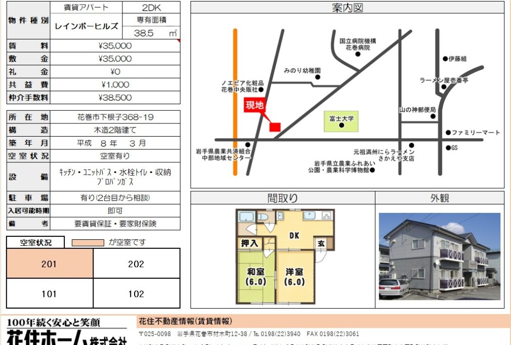 | 所在地 | 花巻市下根子368-19 | 家賃・管理費等 | 3.6万円/家賃35,000円、管理費1,000円 |